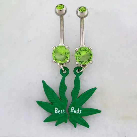 Celebrate friendship, style, and a little 420 love with this matching pair of 14G Best Buds navel barbells. Each belly ring features sparkling light-green gems and a dangling half-leaf charm that reads Best and Buds when paired together. Share them with your favorite smoking buddy, bestie, or partner to let the world know you’re a perfect match.