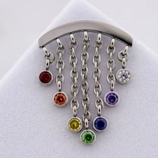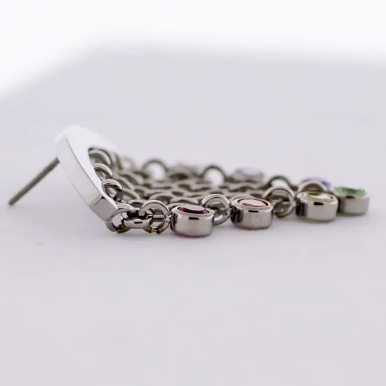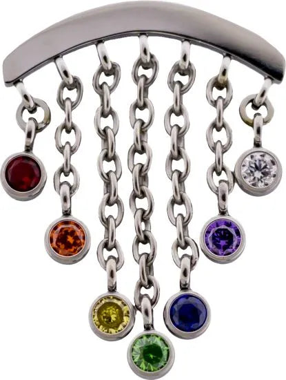 Turn your ear into a statement with this threadless hidden helix curved bar end featuring five cascading chains, each finished with a brilliant rainbow gem. The curved bar design hugs your ear while the dangling gems catch the light with every move—perfect for adding drama, color, and pride to your piercing stack.