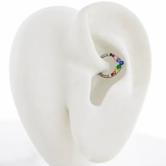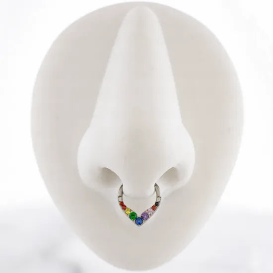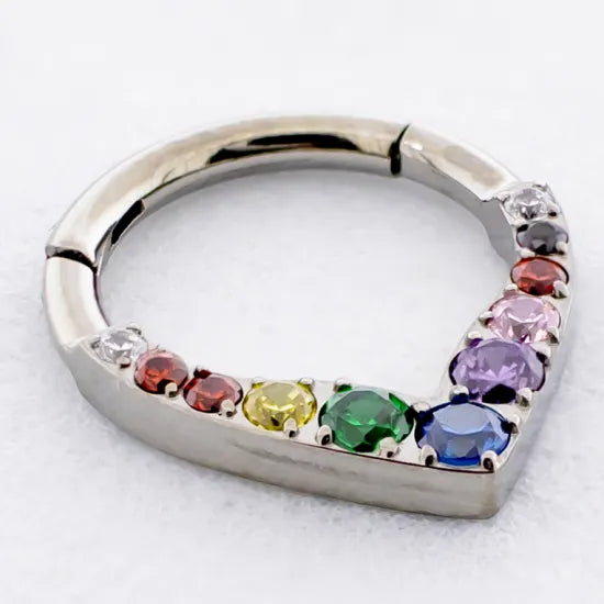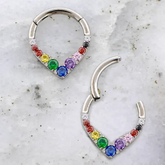 Show off your pride in sleek style with this 16G V-shaped titanium hinged segment ring set with vibrant rainbow gems. The polished titanium design offers durability and comfort, while the hinged closure makes it easy to secure and swap out. The rainbow gradient gems bring color and confidence to any piercing, making it perfect for those who love to shine with pride.